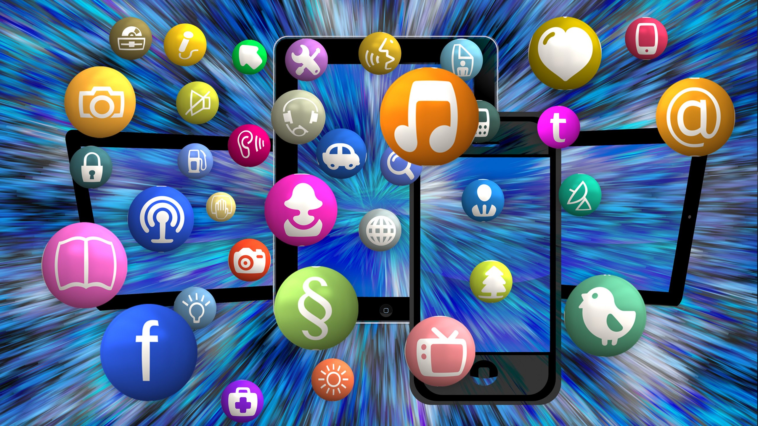 Description: A bunch of different cell phones with different icons on them in a blue background with a blue swirl around them.