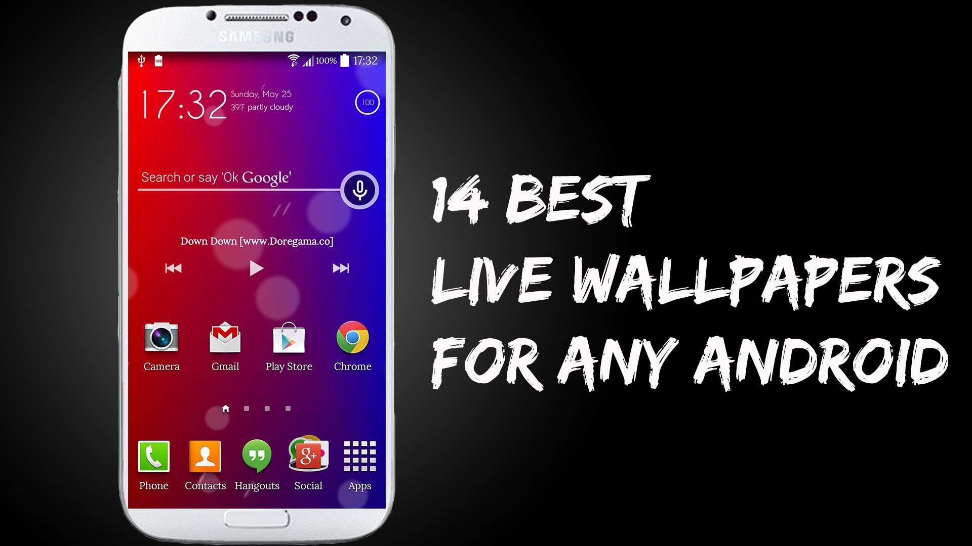 Description: A cell phone with the text best live wallpapers for any android device on it and a black background.