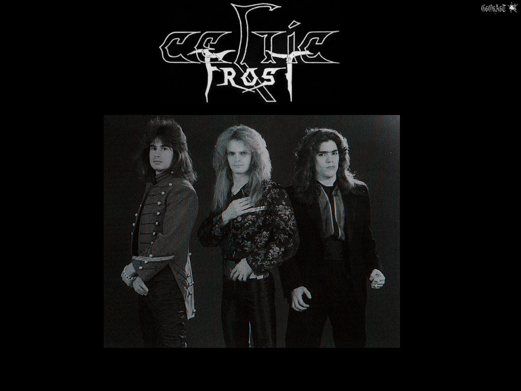 Description: A group of people standing next to each other in front of a black background with the words celtic frost.