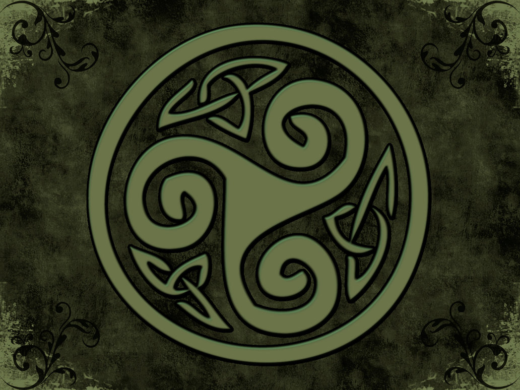 Description: A celtic symbol with a green background and a black background with a swirly design in the center of the circle.