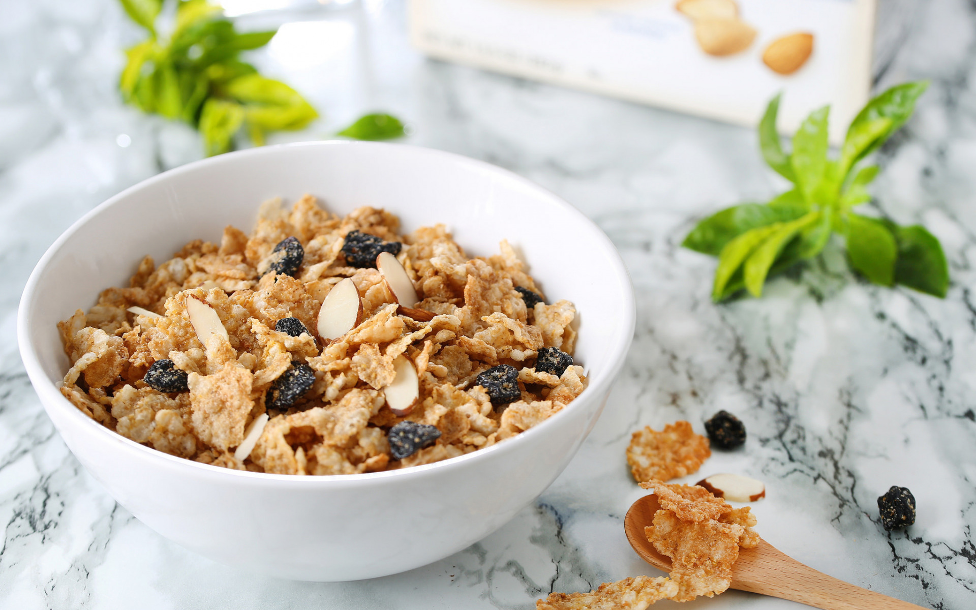 Description: A bowl of cereal with raisins and almonds on a marble counter top next to a book.