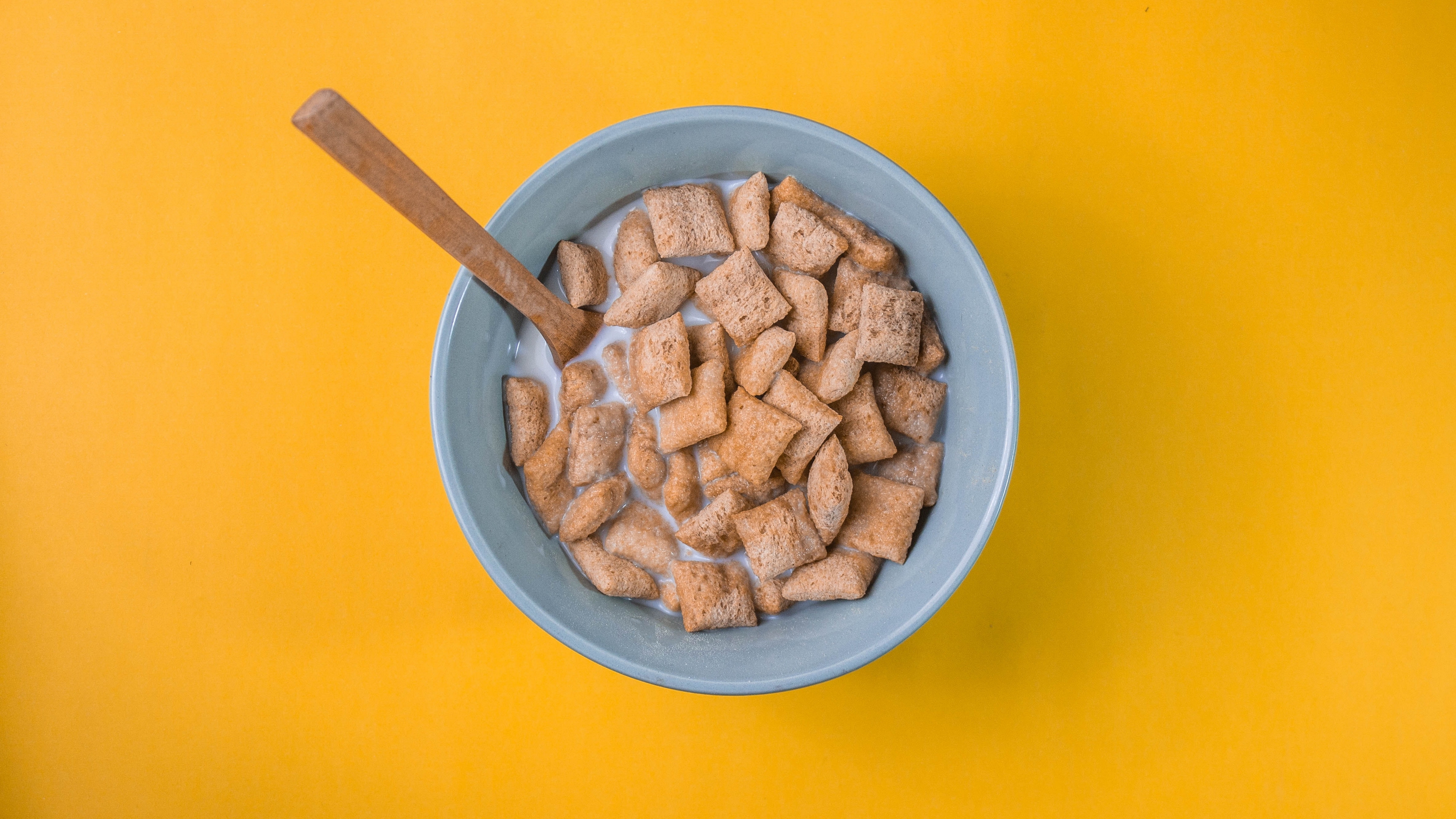 Description: A bowl of cereal with a wooden spoon in it on a yellow background with a yellow background behind it.