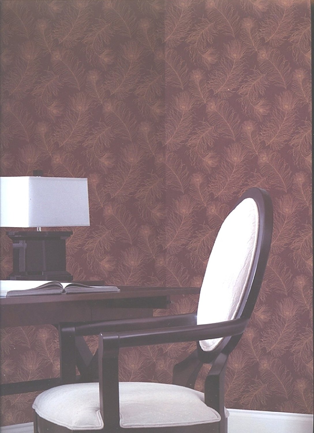 Description: A chair and a desk with a lamp on it in a room with a wall papered with leaves.