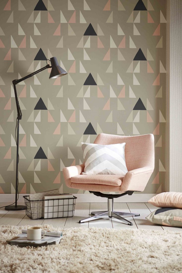 Description: A chair and a lamp in a room with a rug and a wallpaper pattern on the wall behind it.