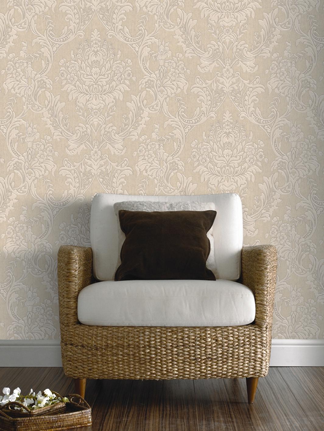 Description: A chair with a pillow on it in a room with a wallpapered wall and a basket of flowers.