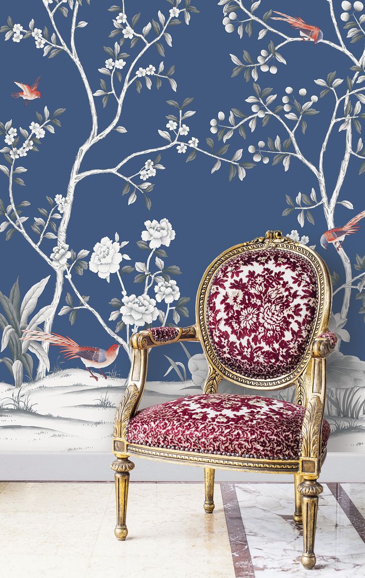 Description: A chair sitting in front of a wall with a tree mural on it's side and birds flying around.