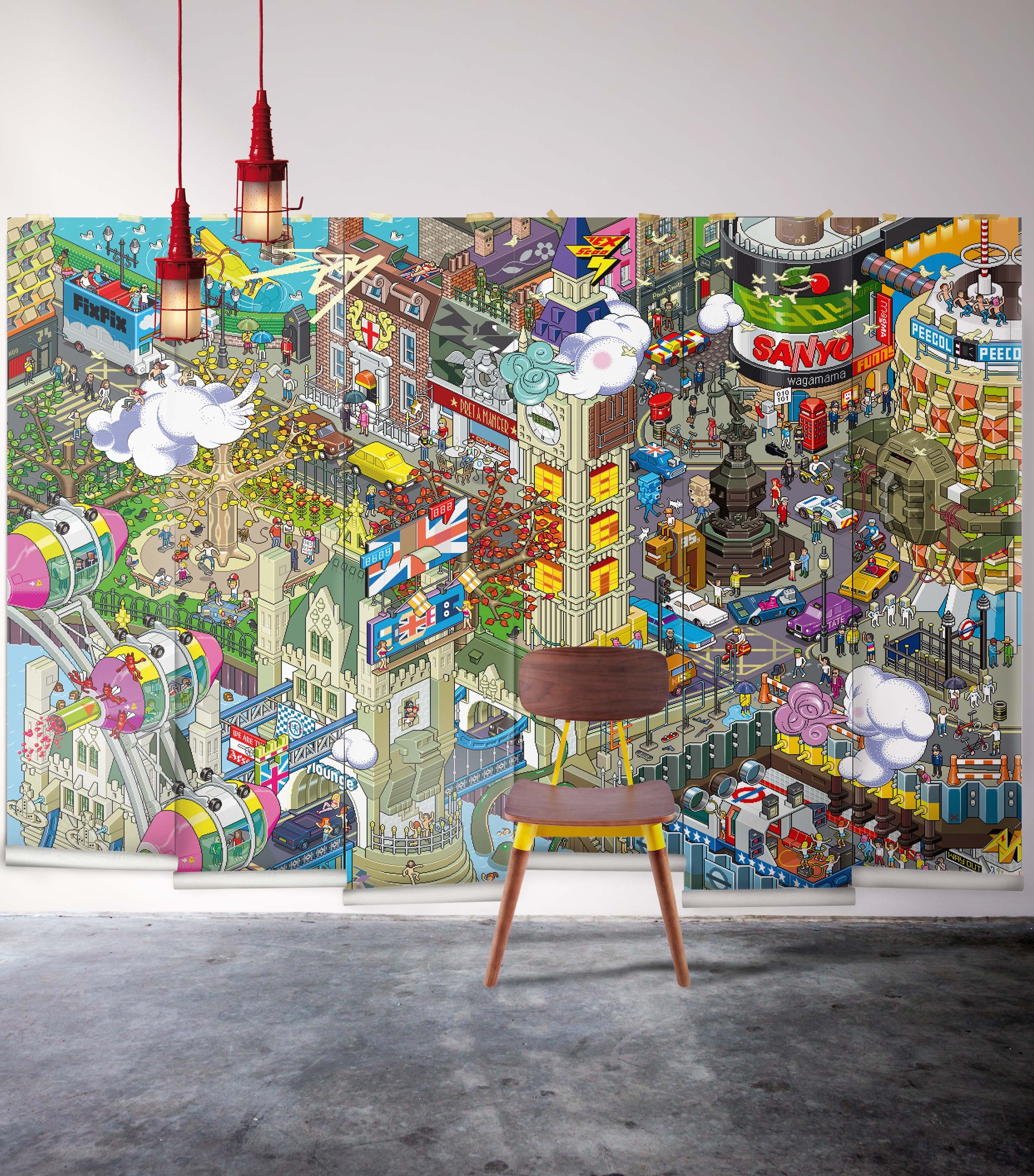 Description: A chair sitting in front of a wall with a large mural on it's side of it's wall.