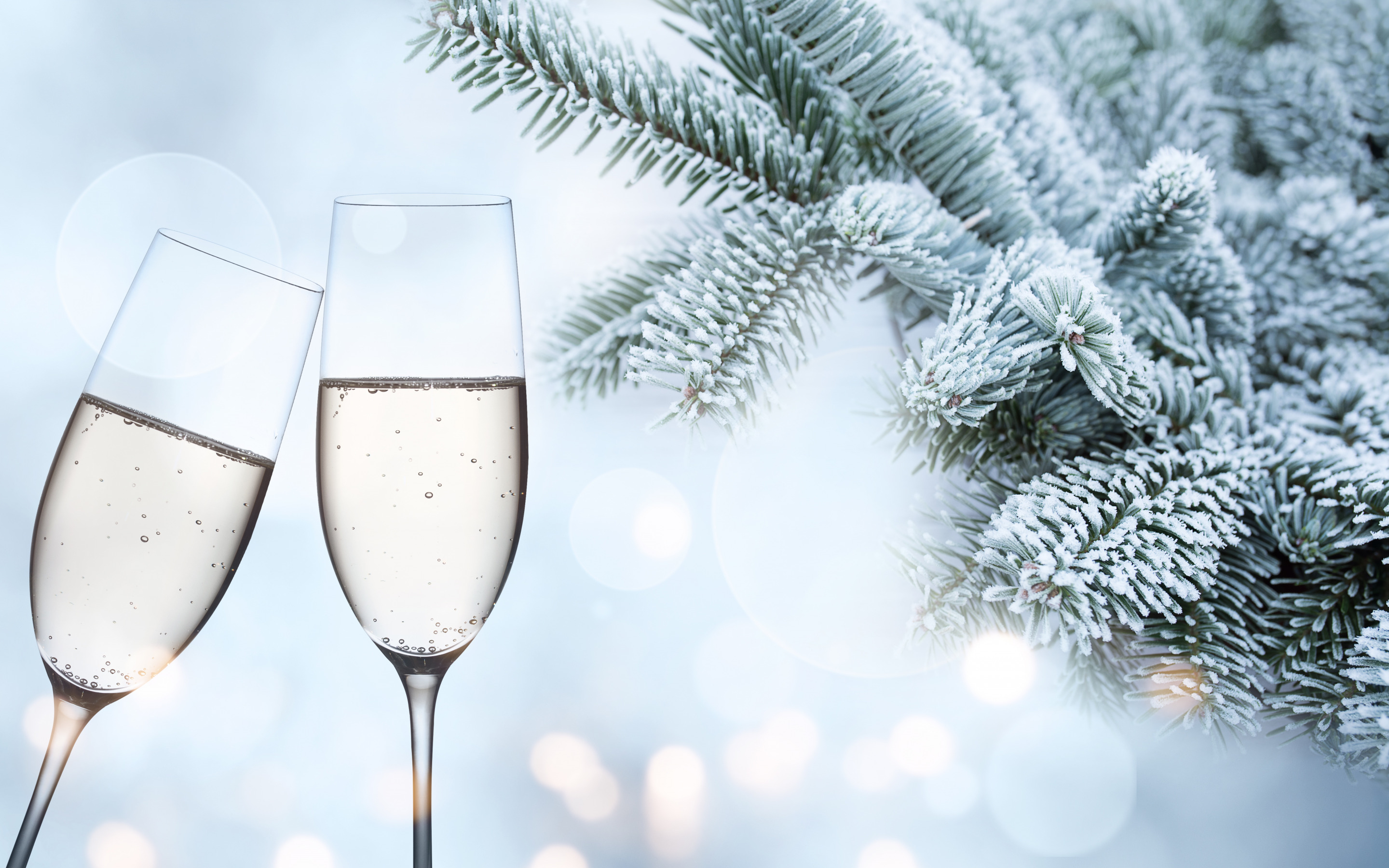 Description: Two champagne flutes are sitting next to a christmas tree branch with snow on it and a blue background with white lights.