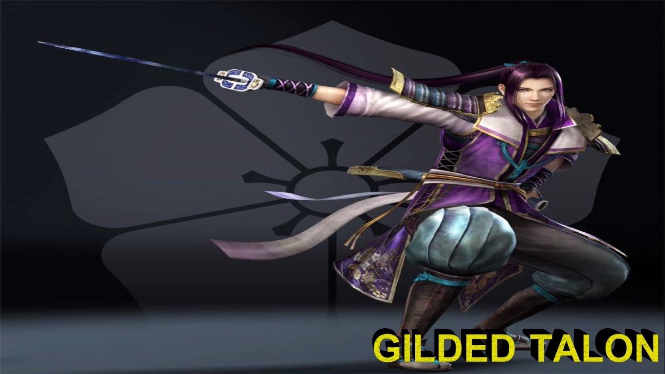 Description: A character in a video game holding a sword and a shield with a shield on it and a caption that reads gilded talon.