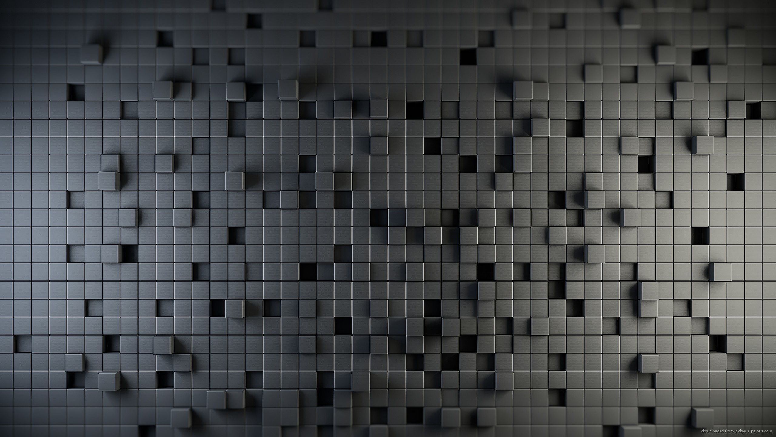 Description: A black and white photo of a wall with squares on it and a black background with a white spot.