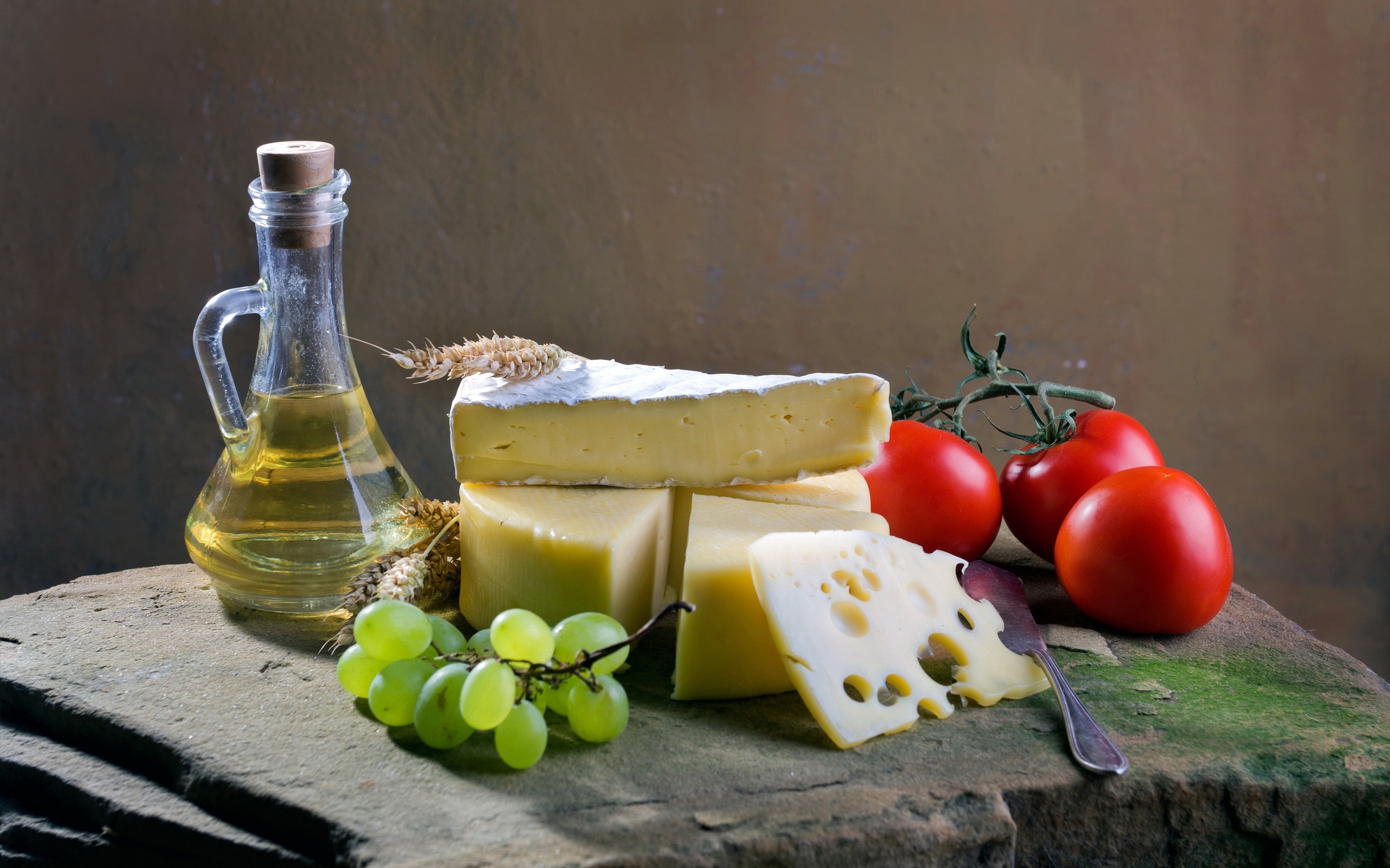 Description: A bunch of cheese and some tomatoes on a table with a bottle of oil and a knife and some grapes.