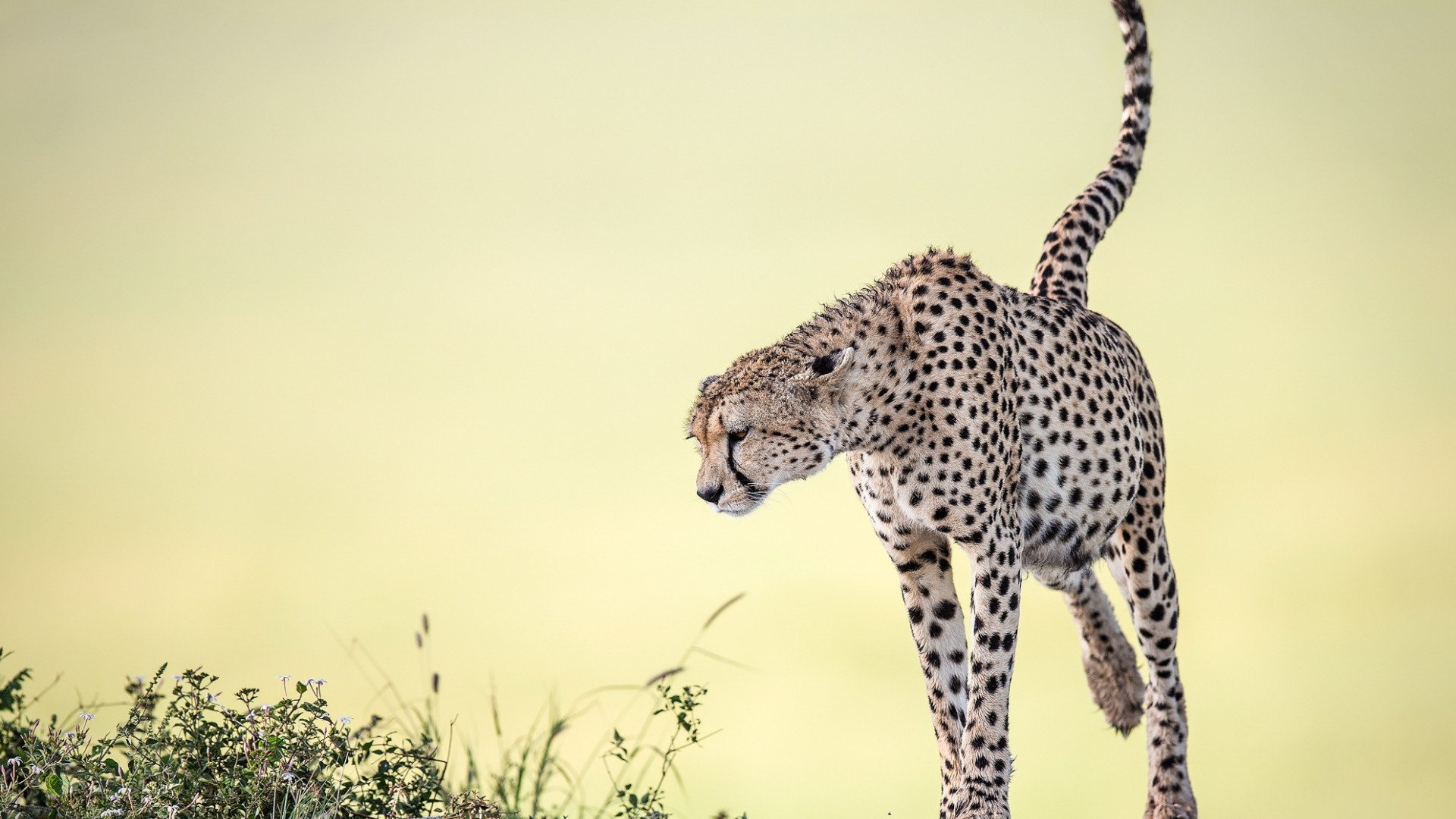 Description: A cheetah walking on a grassy hill with its tail up in the air and its head down.