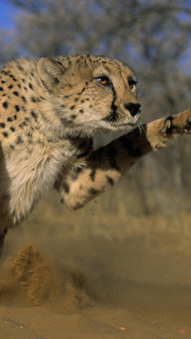 Description: A cheetah running through the dirt with a stick in its mouth and a tree in the background.
