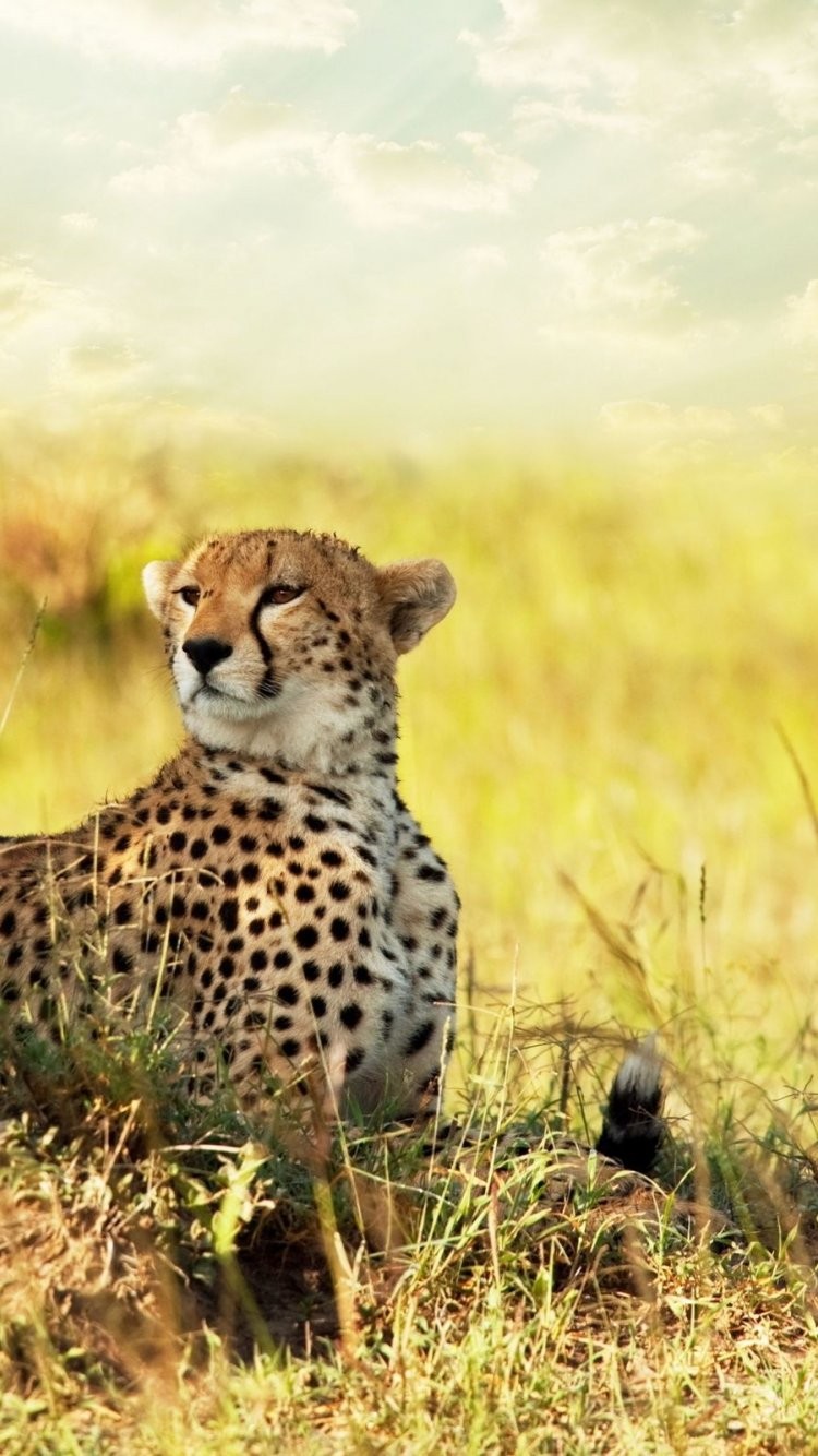 Description: A cheetah sitting in the grass looking at the camera with a sky background and clouds in the background.