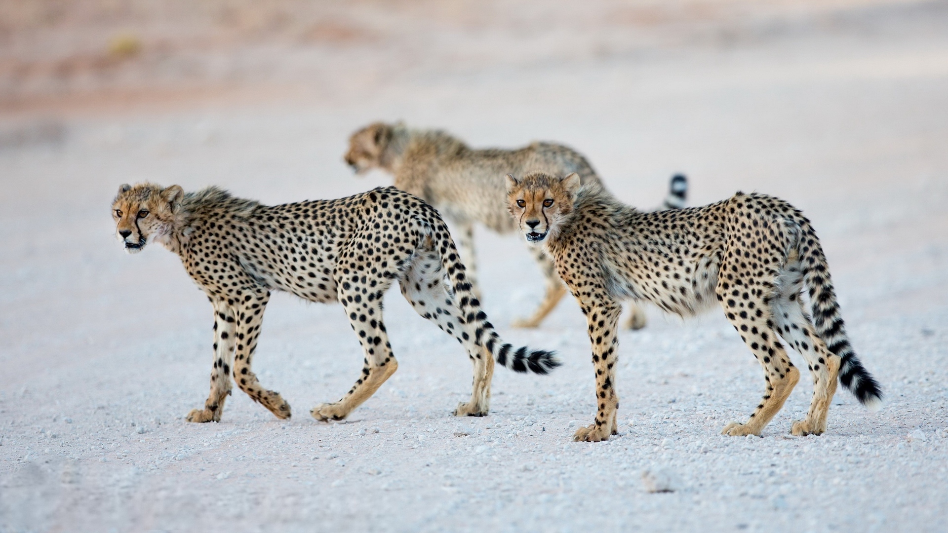 Description: Two cheetah walking in the snow with a bird nearby on a sunny day in the wild.