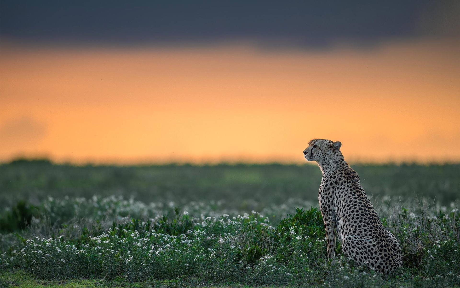 Description: A cheetah sitting in a field of grass at sunset with a sky background and clouds in the distance.