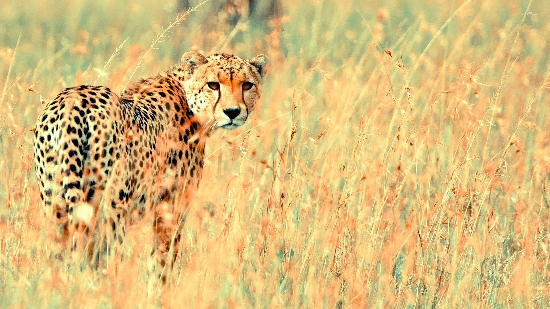 Description: A cheetah standing in a field of tall grass looking at the camera with a blurry background.