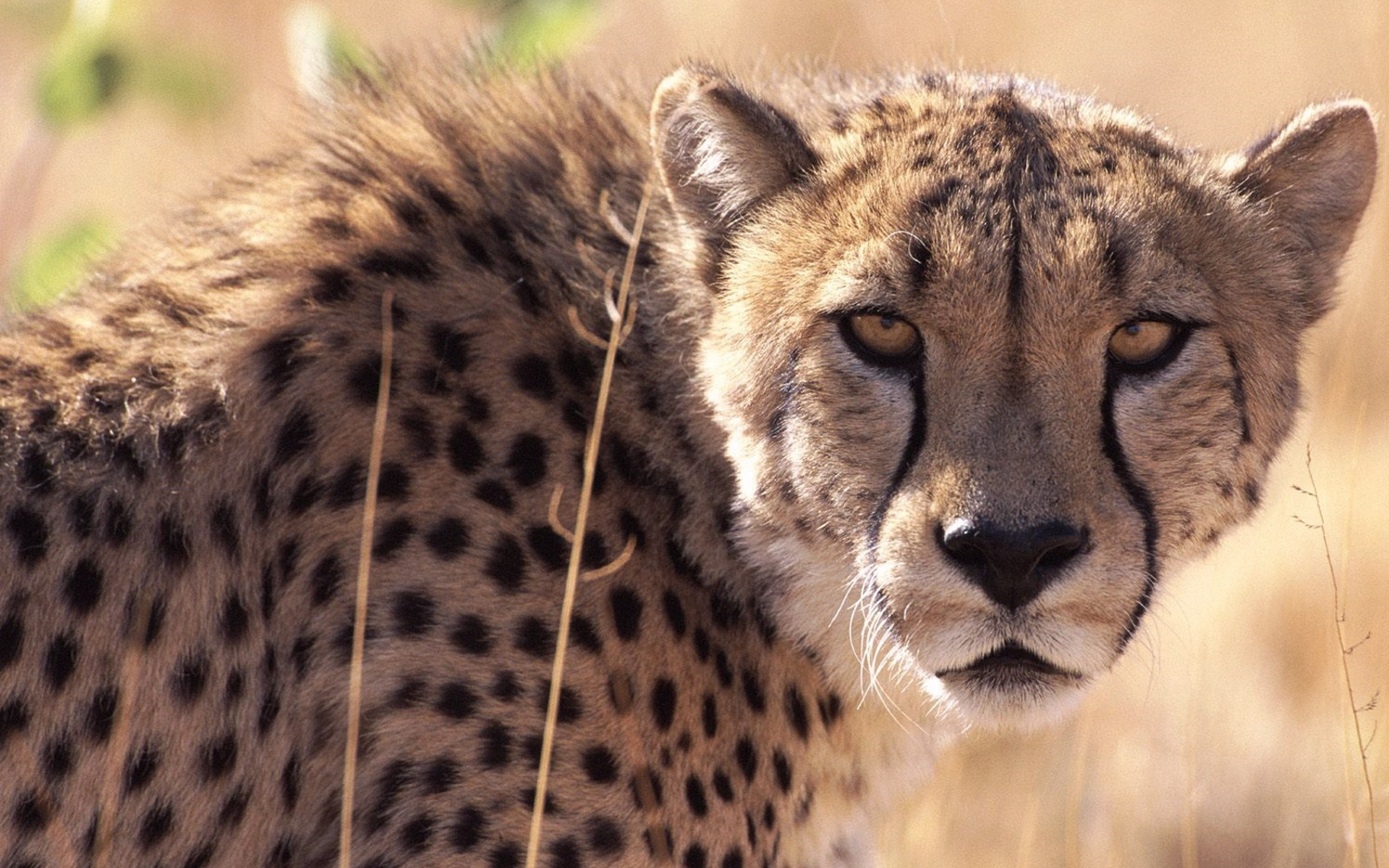 Description: A cheetah is standing in the tall grass looking at the camera with a sad look on its face.