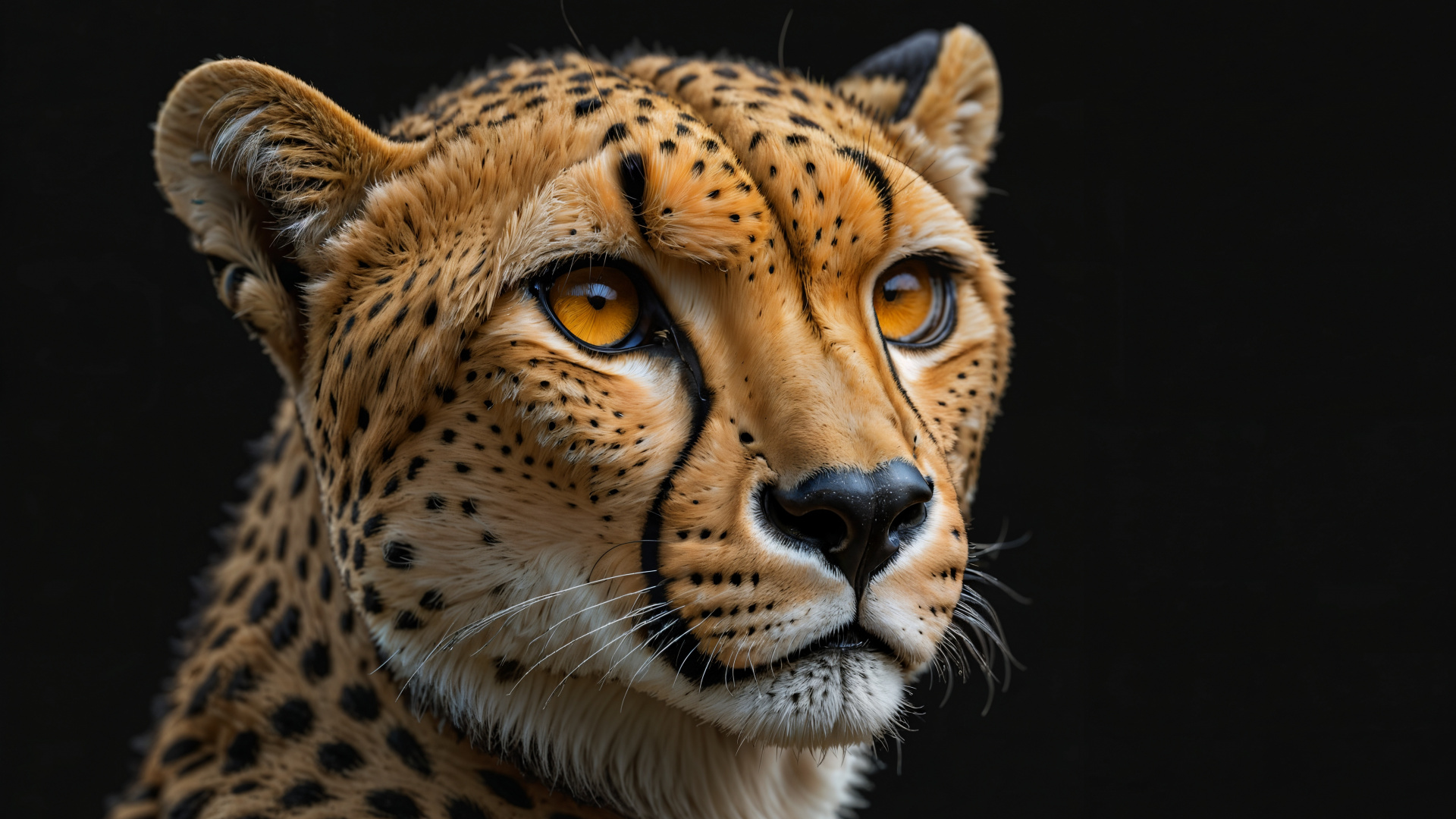 Description: A cheetah with yellow eyes and a black background is looking at the camera with a serious look on its face.