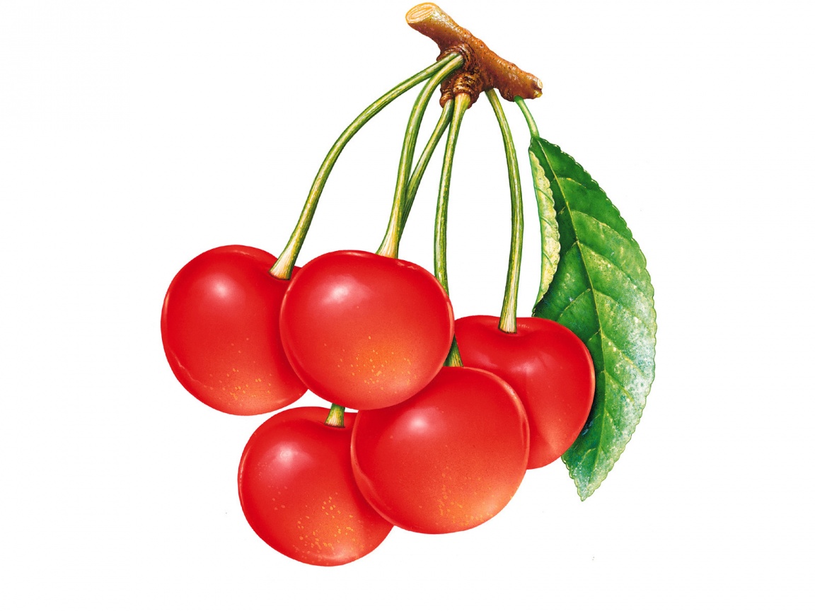Description: A bunch of cherries with leaves on a white background with a green leaf on the top of the cherries.