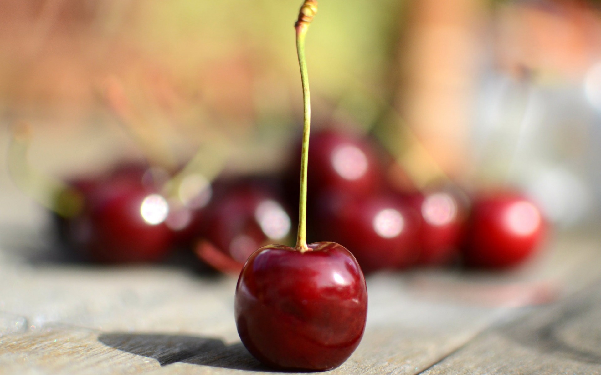 Description: A group of cherries sitting on top of a wooden table next to each other on a table top.