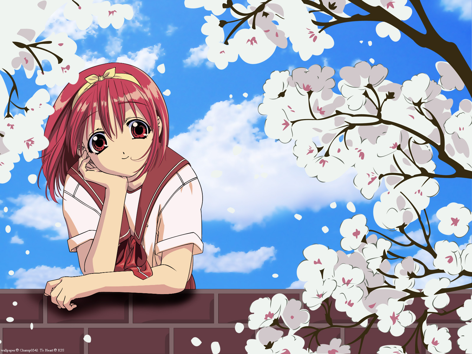 Description: A girl sitting on a brick wall with cherry blossoms in the background and a blue sky with clouds in the background.