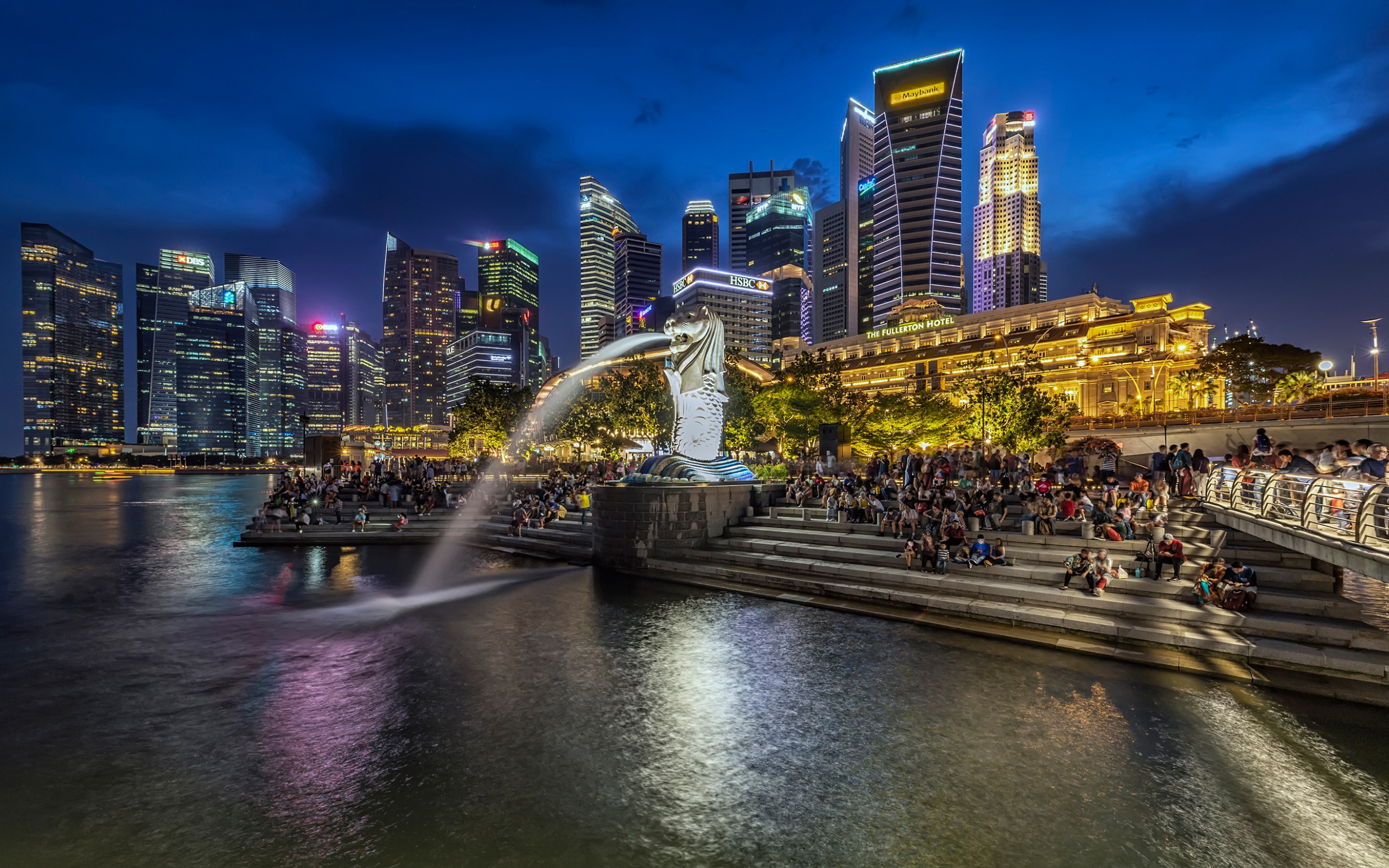 Description: A city skyline with a fountain in the foreground and people walking on the steps to the water below.