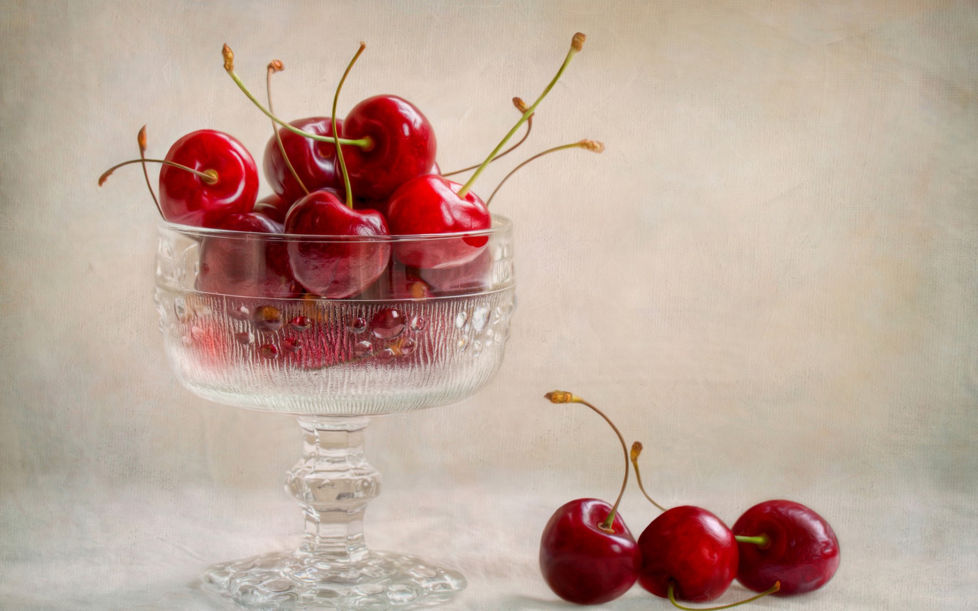 Description: A glass bowl filled with cherries on top of a table next to a glass vase filled with cherries.