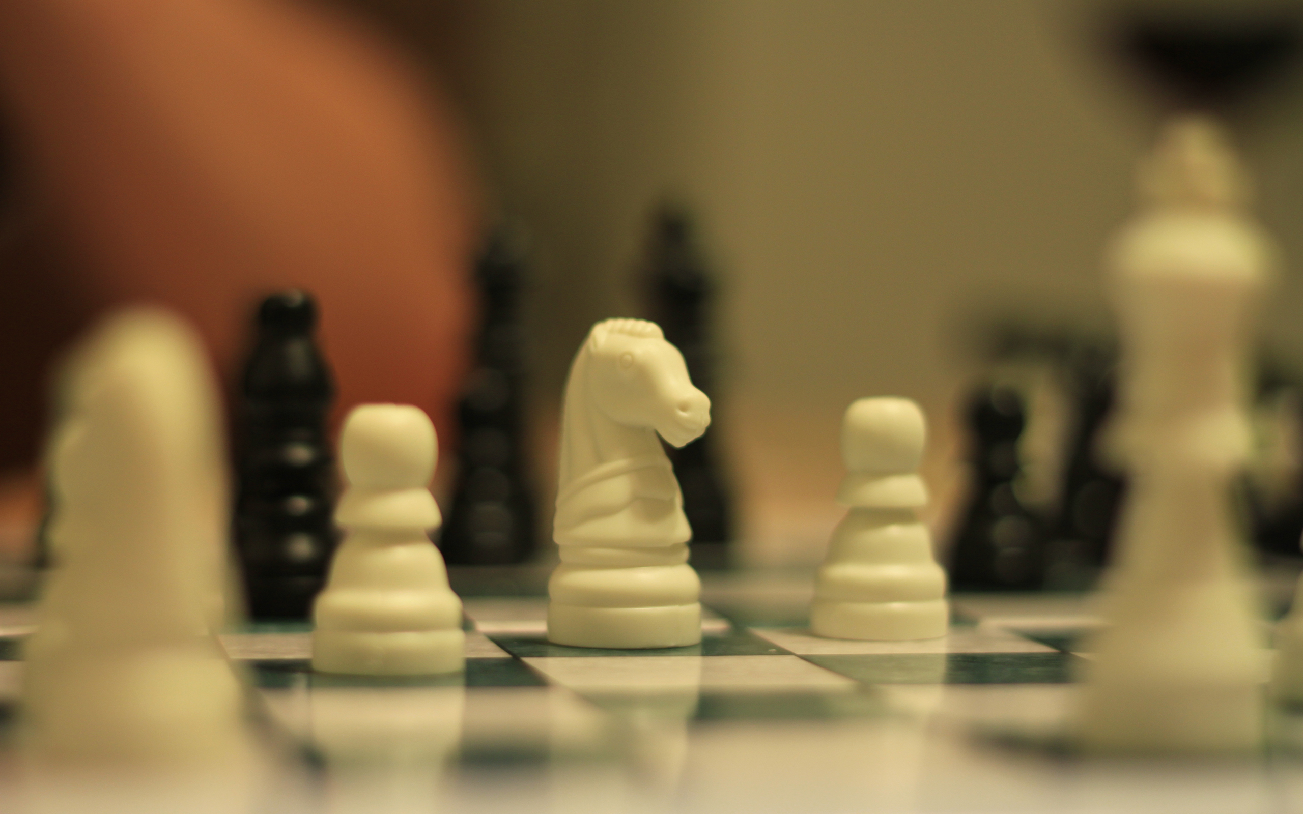 Description: A chess board with a white horse on it and black pieces on the board and a person in the background.