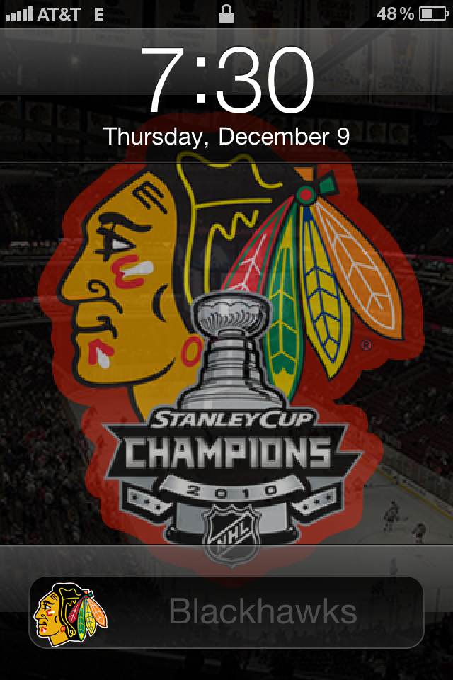 Description: A cell phone with a chicago black hawks logo on it and a hockey logo on the screen with the words stanley cup champs.
