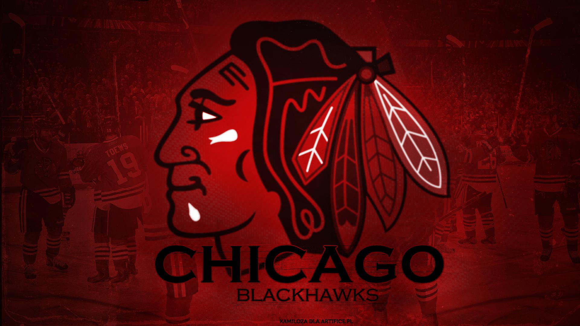 Description: Chicago black hawks logo on a red background with other black and white players in the background and a red light.