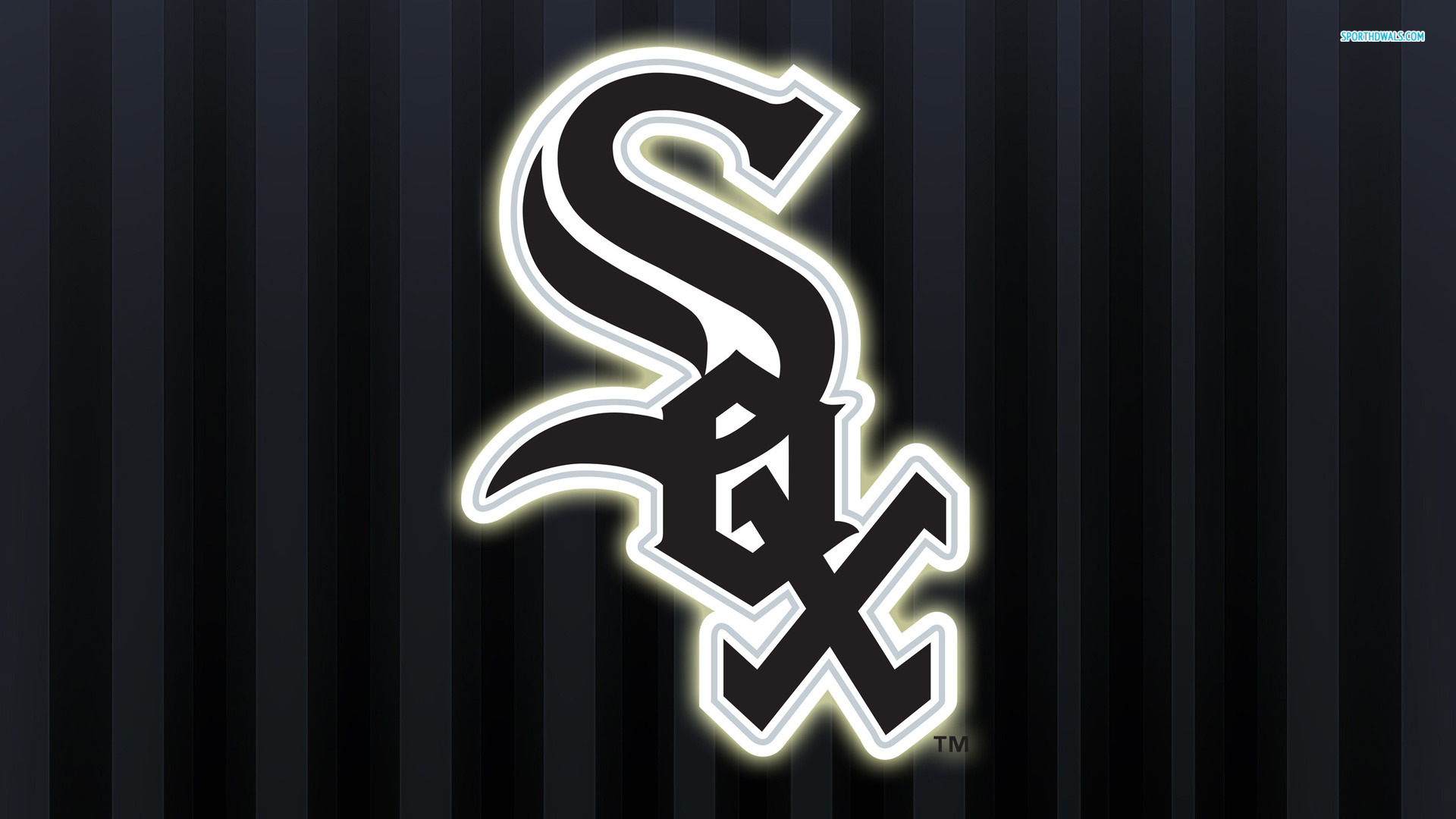 Description: A chicago white sox logo on a black background with vertical stripes and a neon light in the middle of the image.
