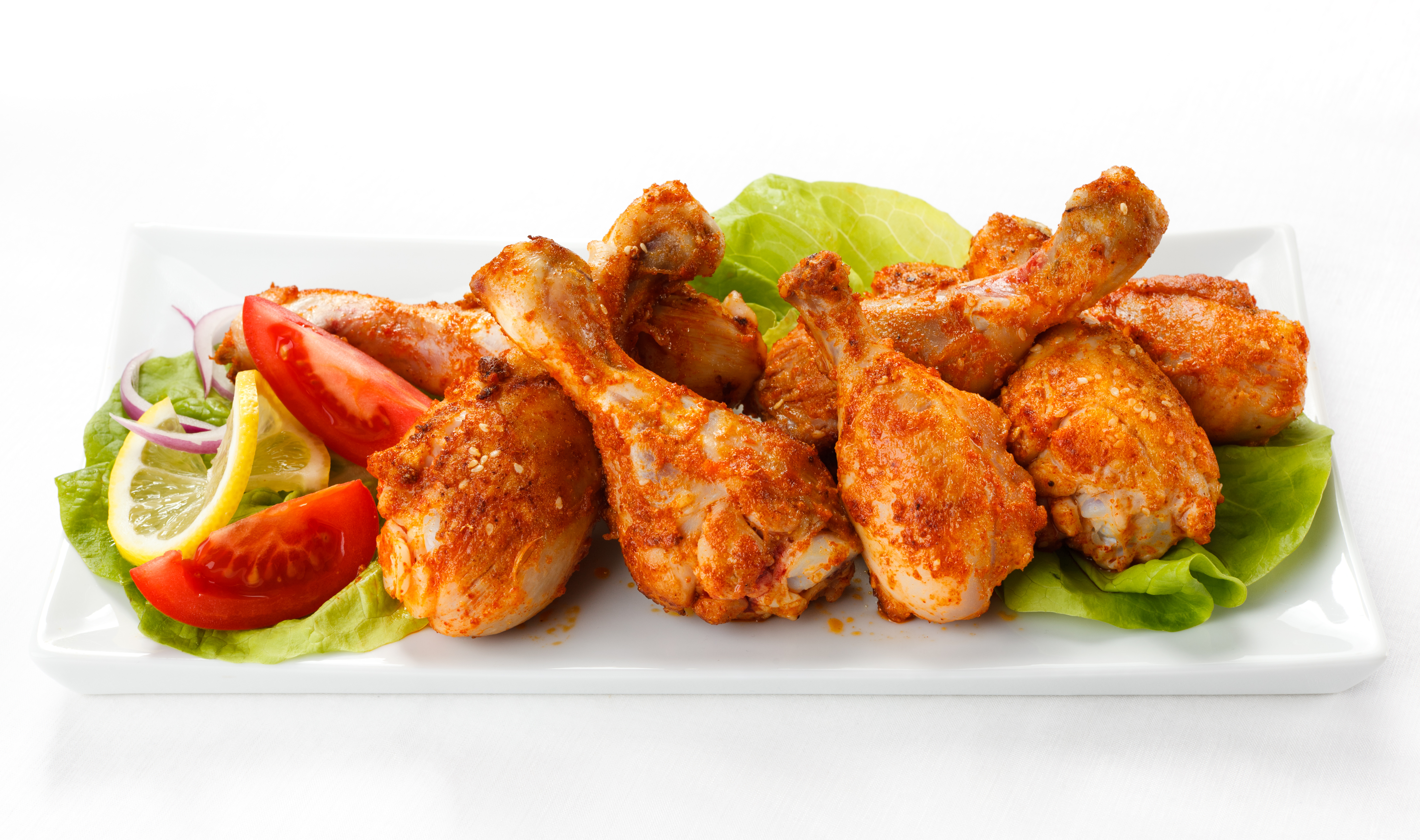 Description: A plate of chicken wings with lettuce and tomatoes on it with a side of salad and a lemon wedge.