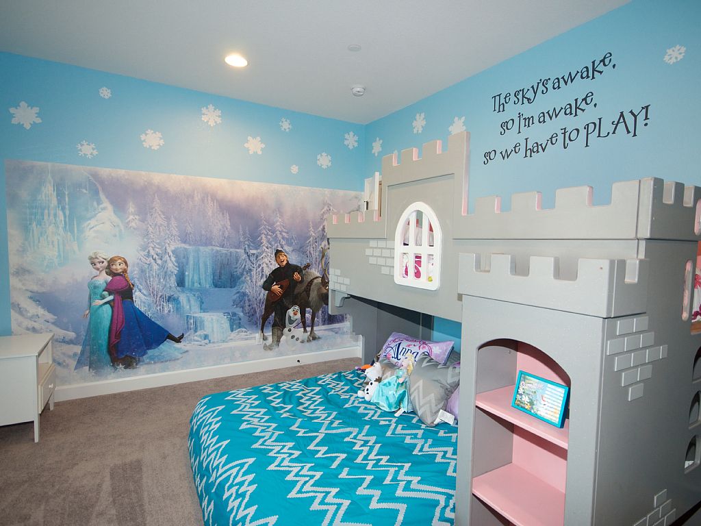 Description: A child's bedroom with a castle bed and a mural of a man on a horse and a princess on a snowy background.