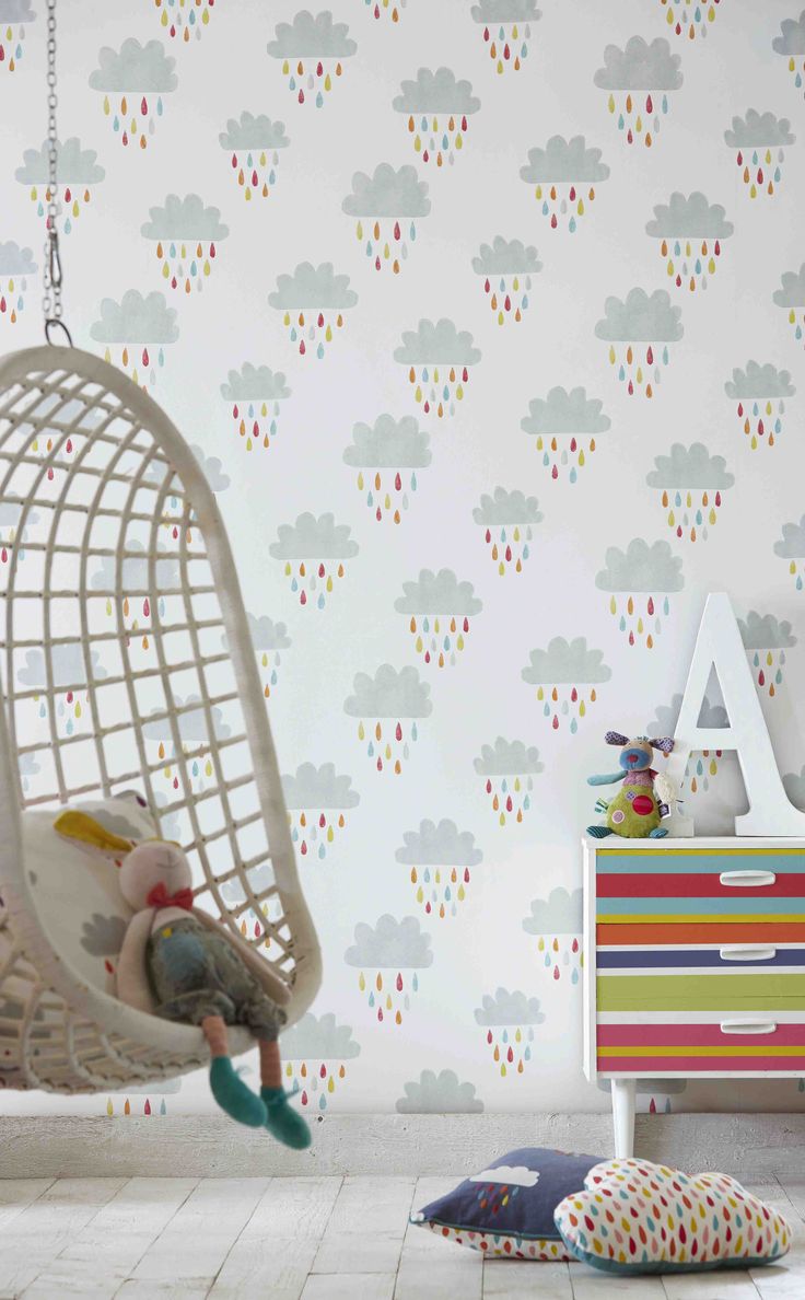 Description: A child's bedroom with a swing chair and a wallpapered wall with clouds and a bird.