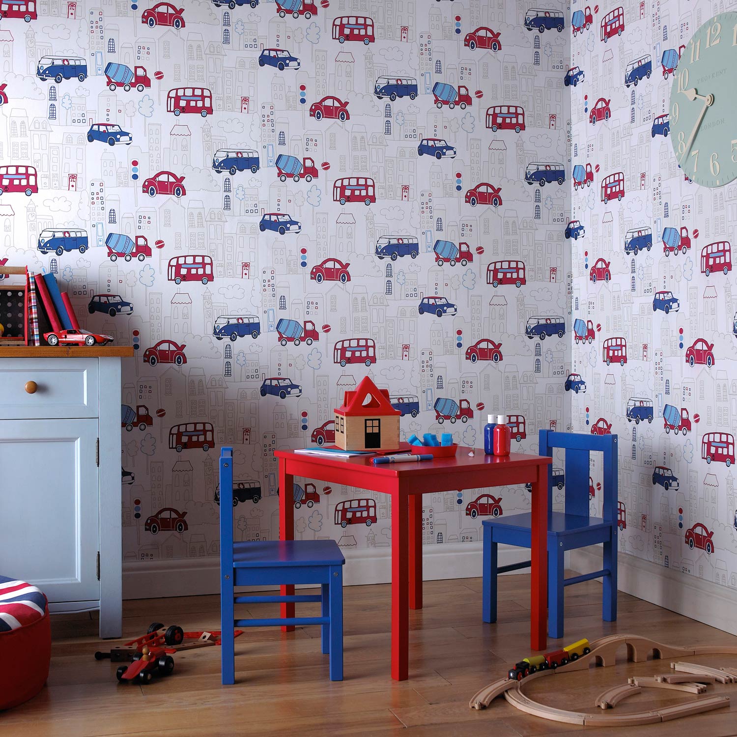 Description: A child's room with a table and chairs and a wallpaper with cars on it and a clock.