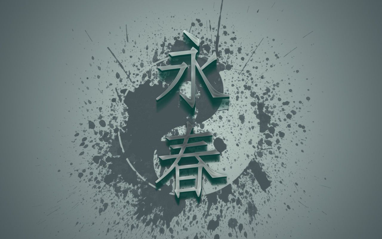 Description: A chinese symbol with a grungy background and a splash of paint on it.