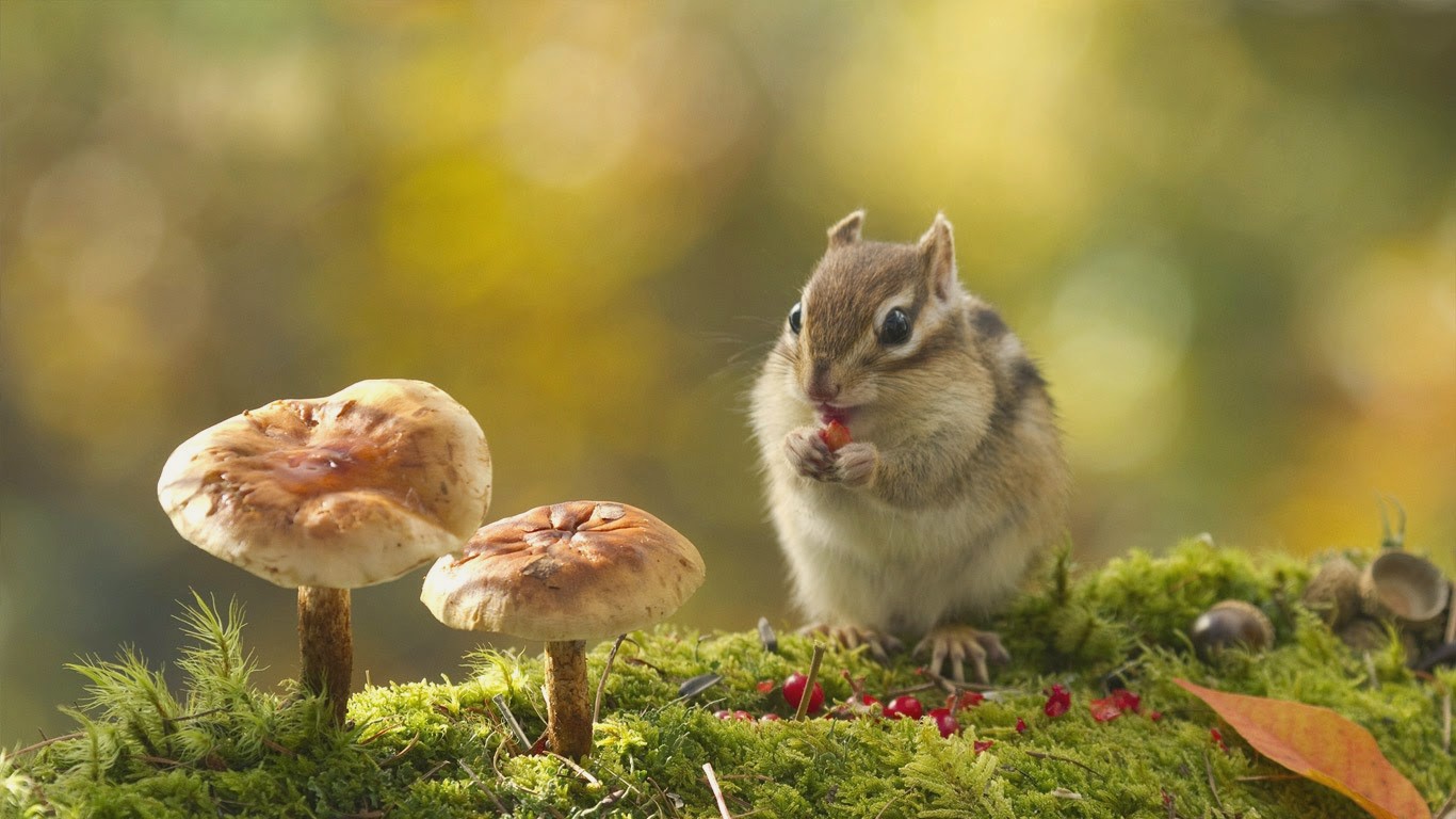 Description: A small chipmung sitting on a mossy surface next to mushrooms and mushrooms on the ground with leaves.