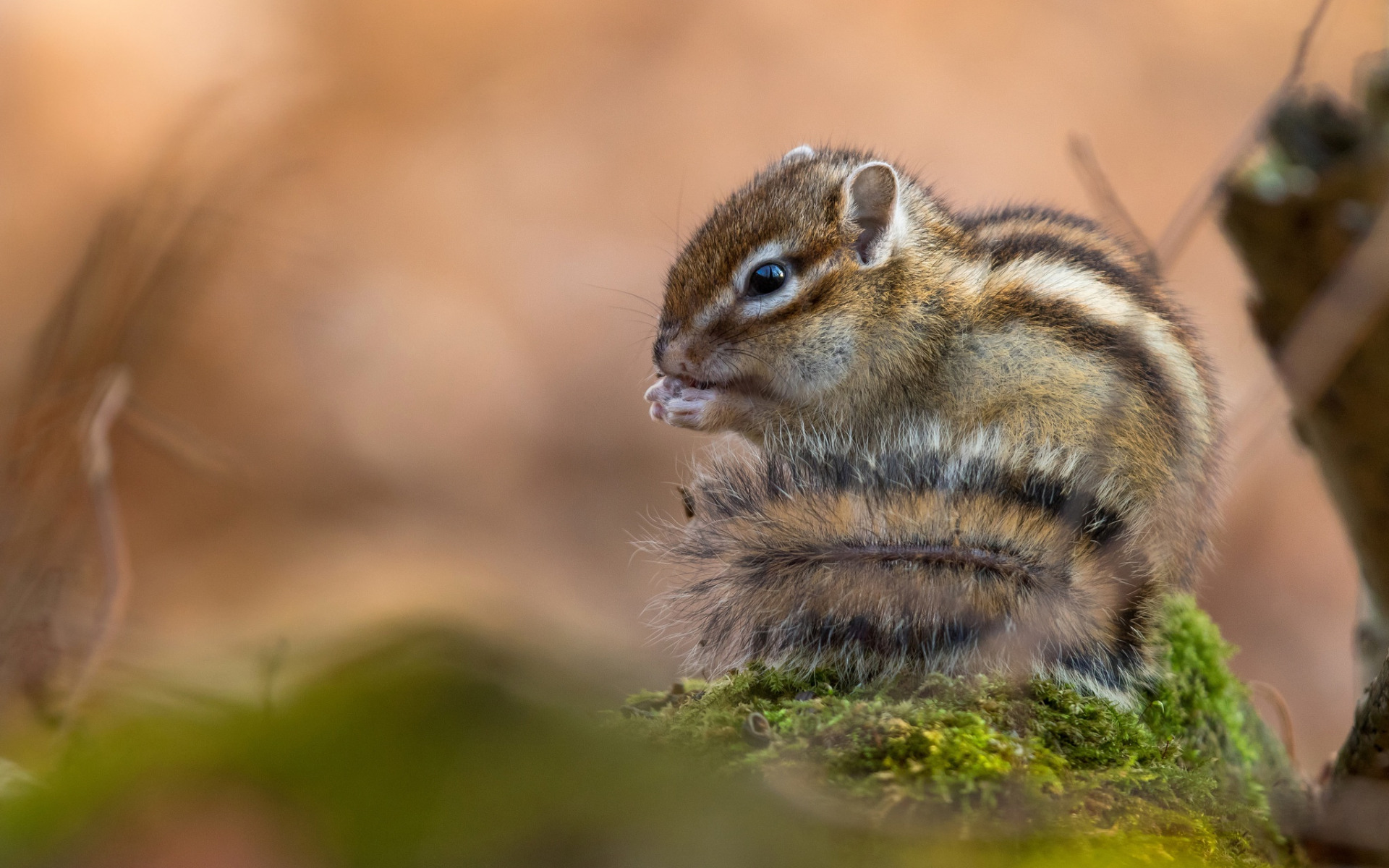 Description: A small chipper chipper sitting on a mossy branch in the woods with its mouth open and tongue out.