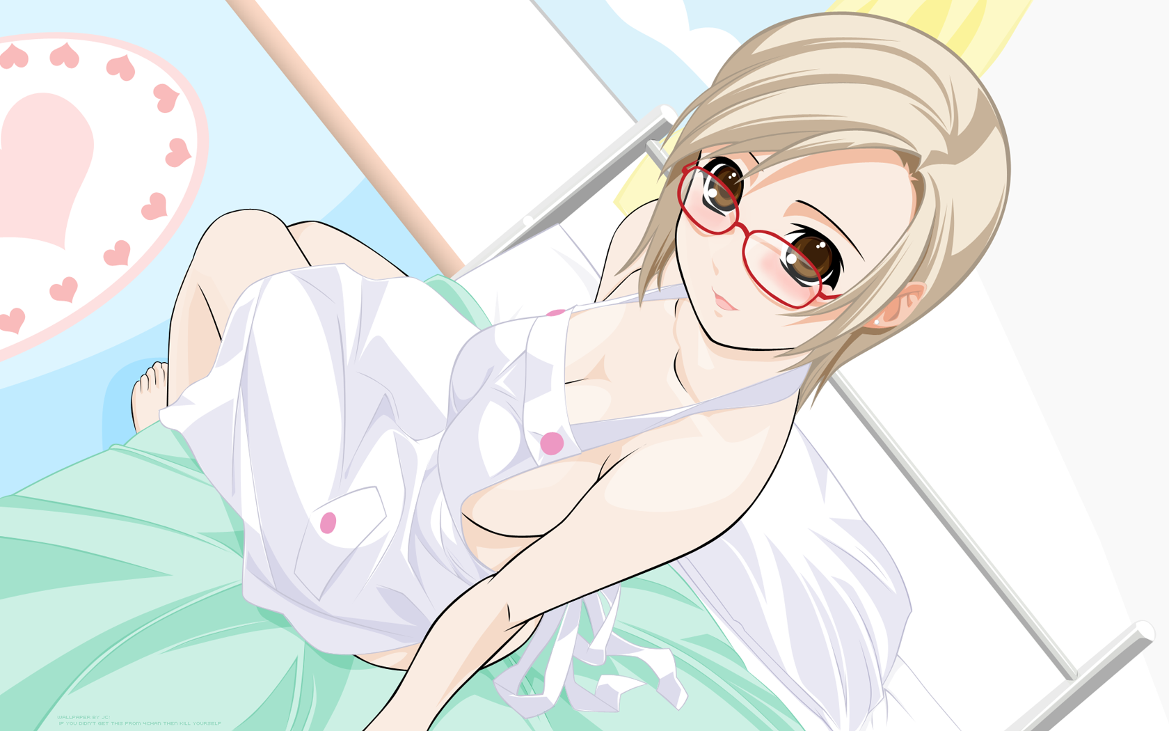 Description: A cartoon girl with glasses laying on a bed with a pillow and a pillow behind her.