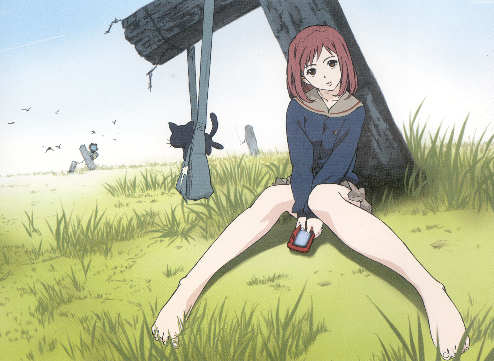 Description: A girl sitting on the ground with a cell phone in her hand and a cat in the background.
