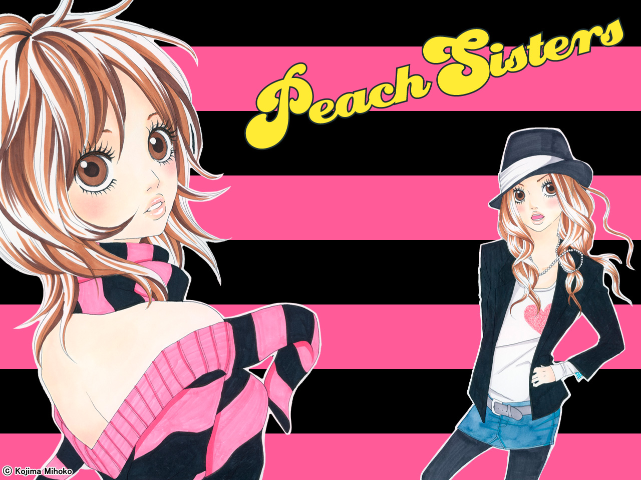 Description: A girl in a pink and black striped shirt and a girl in a black and pink striped shirt and a girl in a pink and black hat.