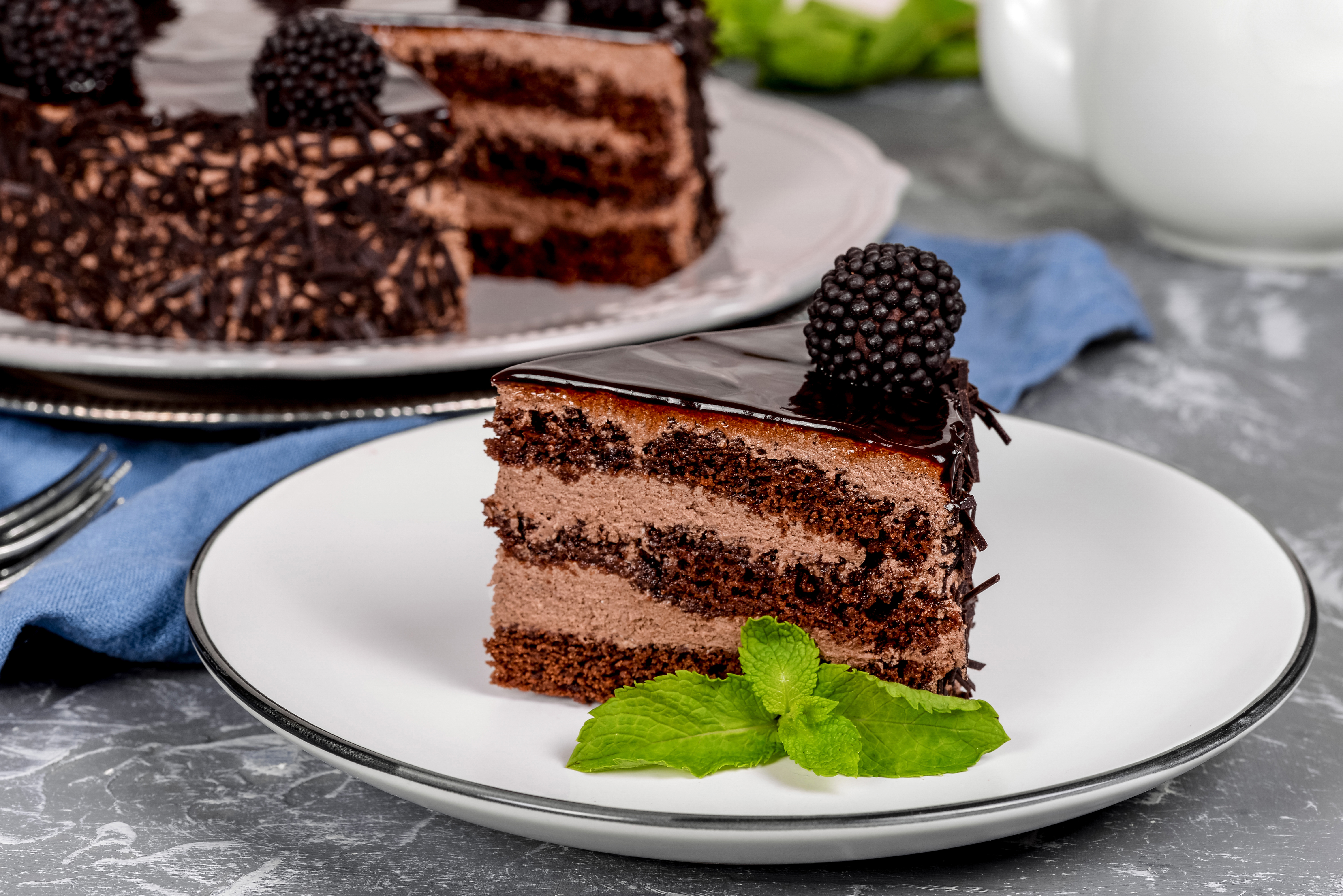 Description: A slice of chocolate cake with a chocolate frosting and blackberries on top of it on a plate.