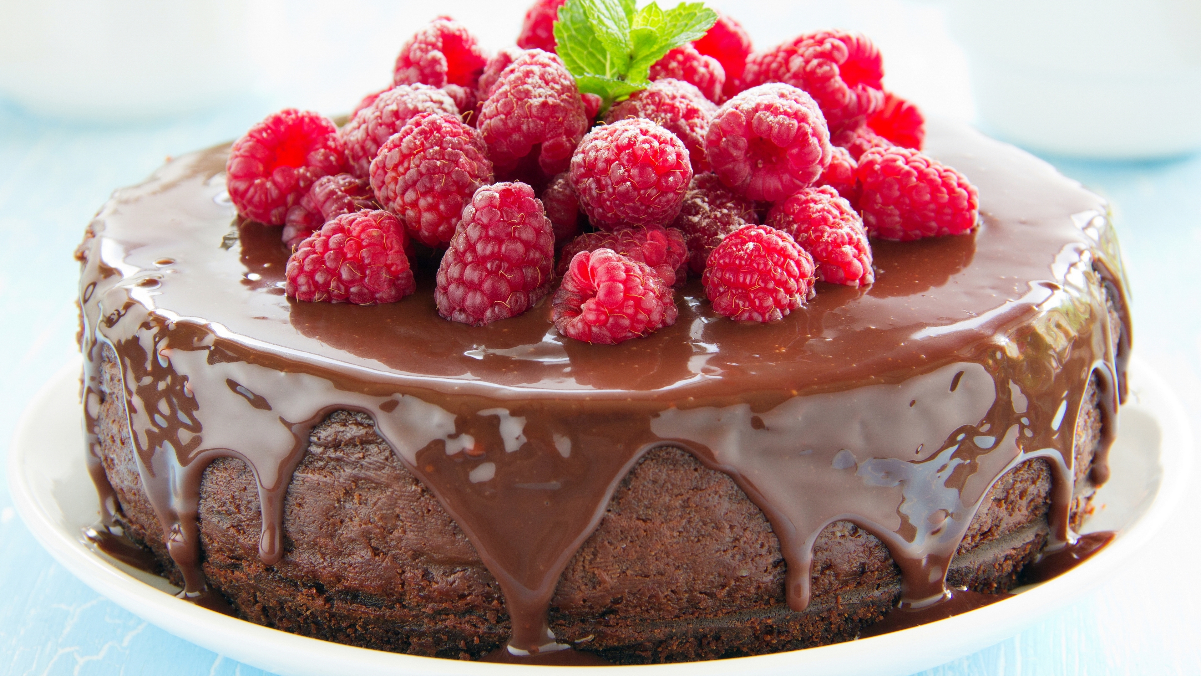 Description: A chocolate cake with raspberries on top of it on a plate with a cup of coffee in the background.