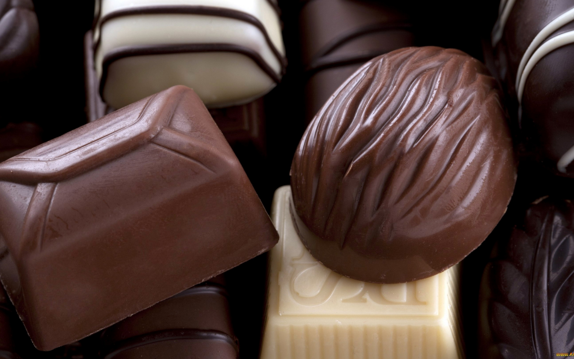 Description: A close up of a chocolate candy bar with a chocolate candy bar in the middle of it's chocolates.