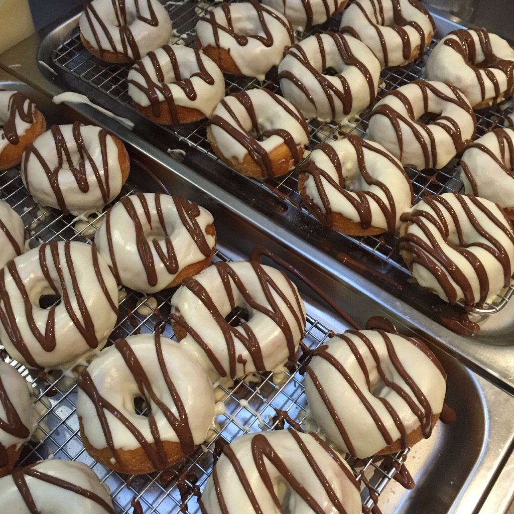 Description: A couple of trays of donuts with chocolate drizzled on them and a couple of trays of donuts with donuts on them.