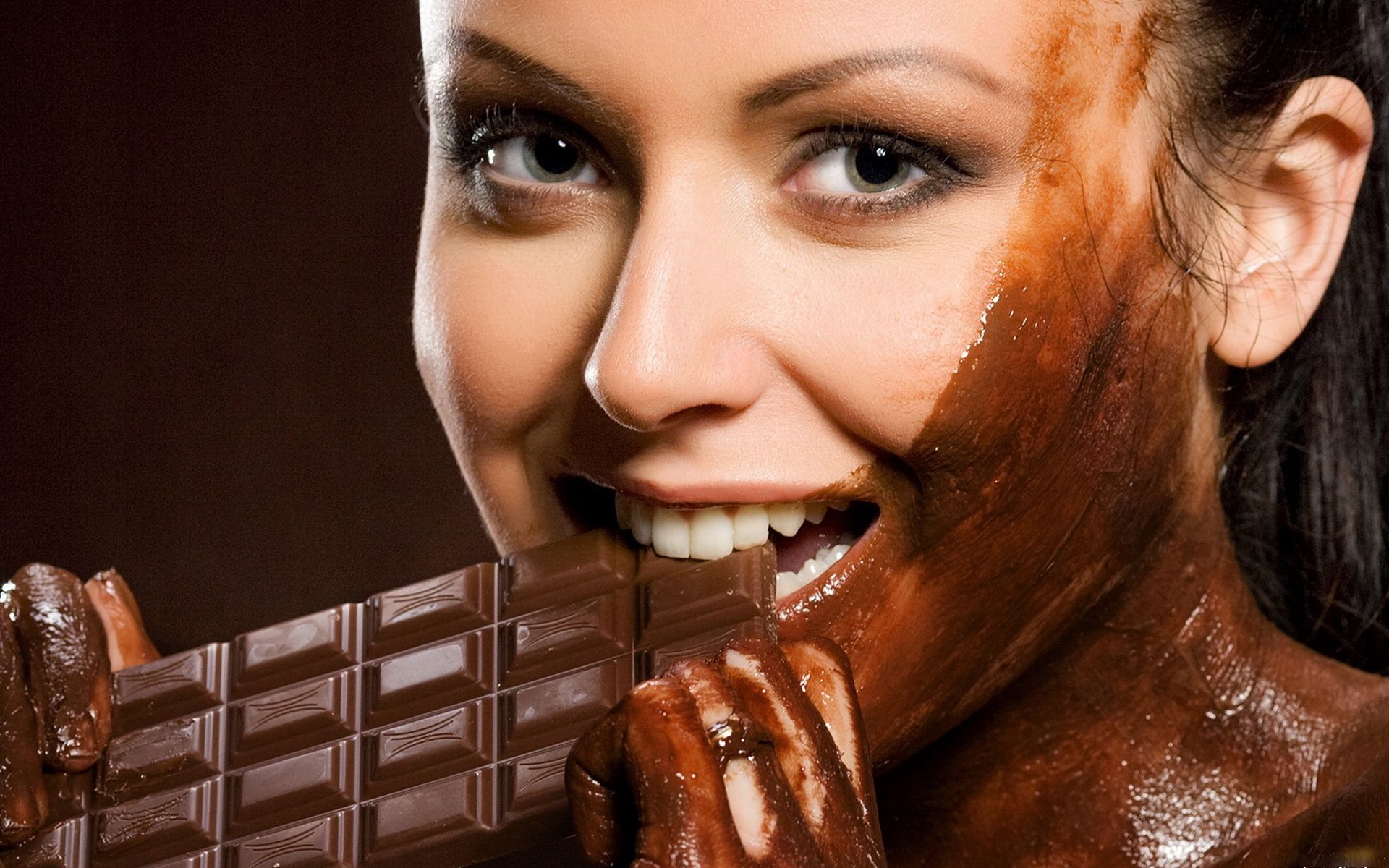 Description: A woman with chocolate on her face and a chocolate bar in her hand.