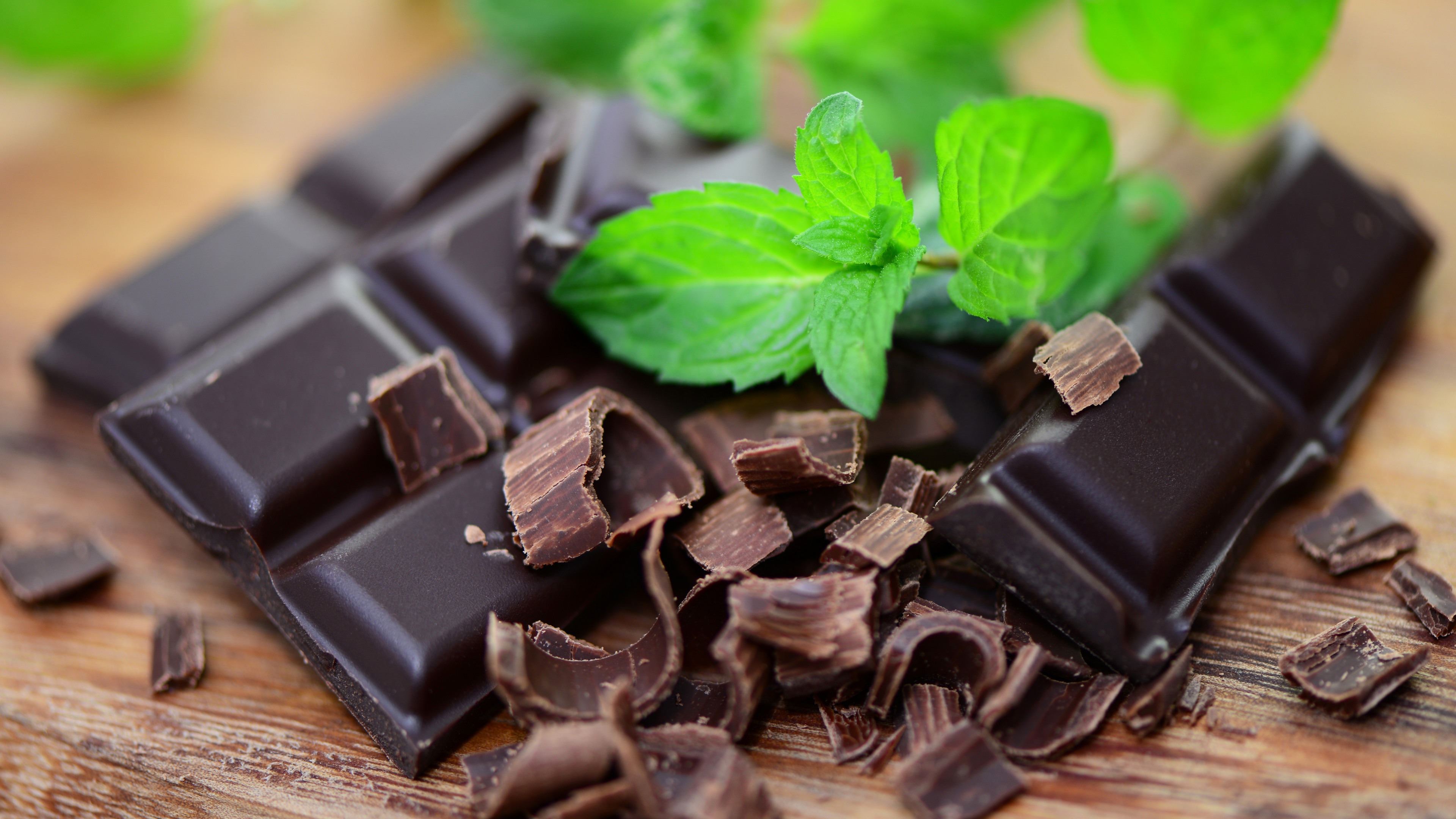 Description: A close up of a chocolate bar with mint leaves on top of it and a wooden cutting board with a knife.