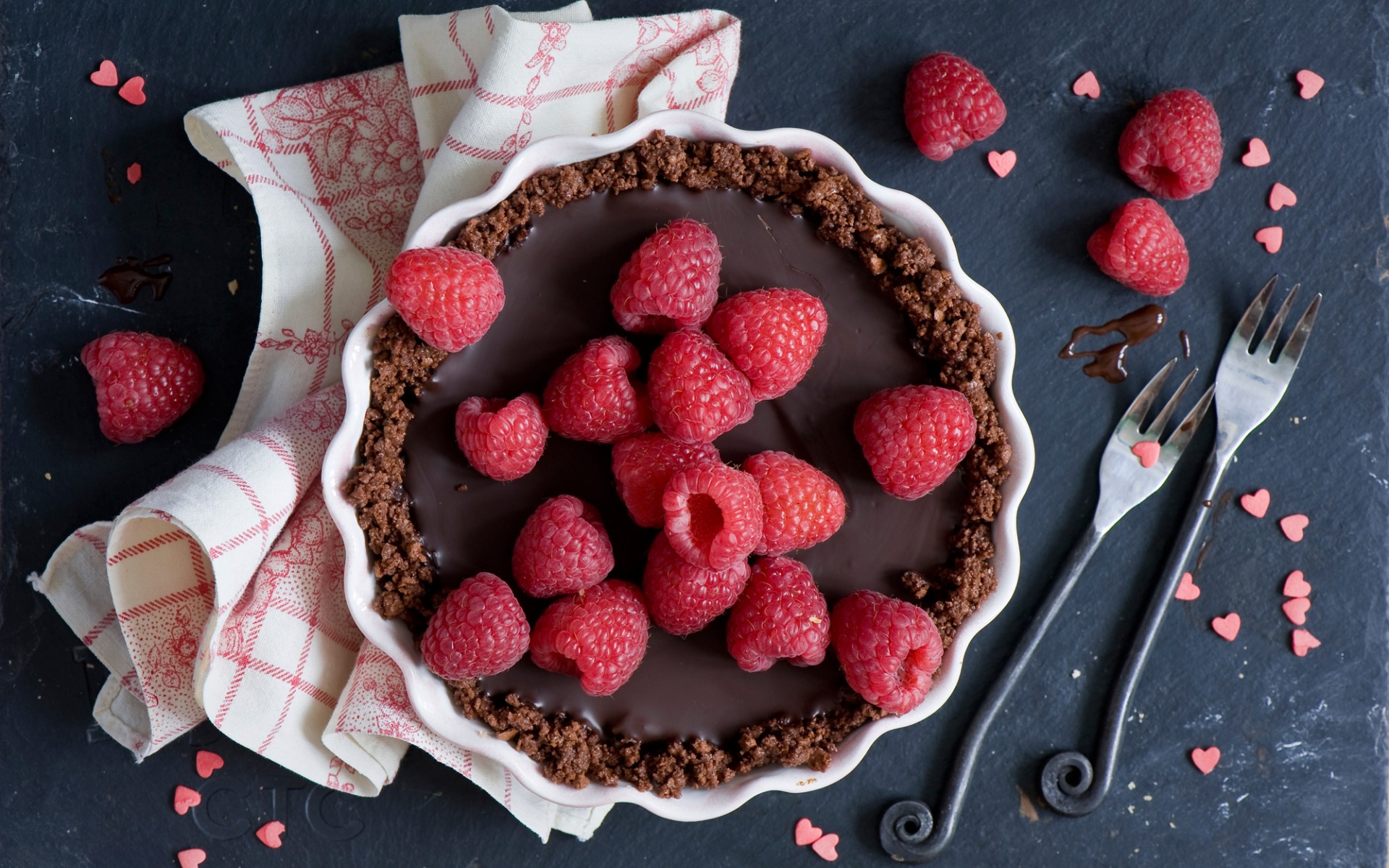 Description: A chocolate pie with raspberries on top of it and a fork and knife next to it on a table.