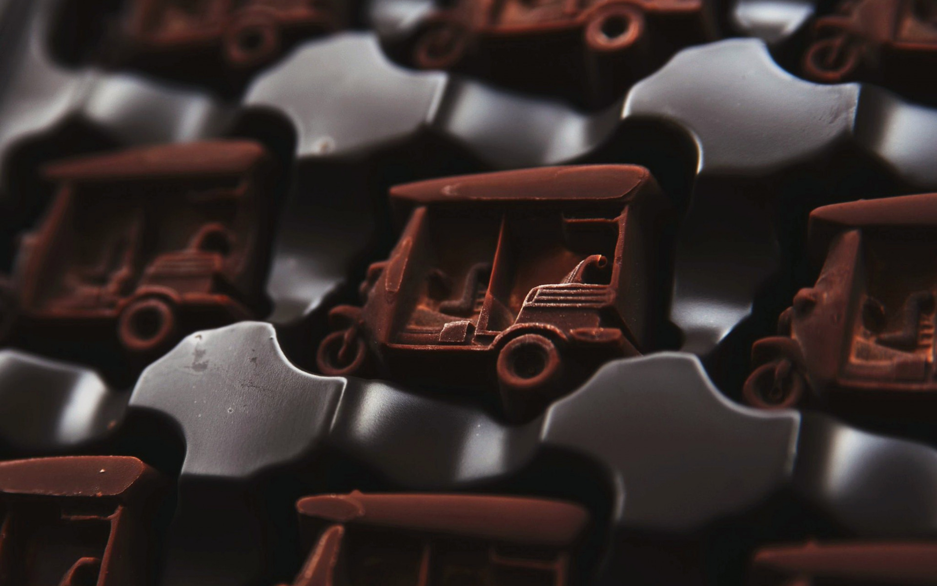 Description: A close up of a chocolate model of a truck and a forklift on a keyboard with other chocolates.